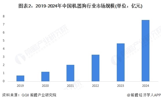 近年来,我国机器狗市场快速增长,娱乐、教育、巡检等领域需求成为主要推动力。据GGII数据,2023年中国机器狗市场规模达4.68亿元,同比增长42.7%,2019-2023年CAGR高达59.7%。结合历年统计数据及市场变动情况,初步统计,2024年我国机器狗市场规模约7.55亿元。