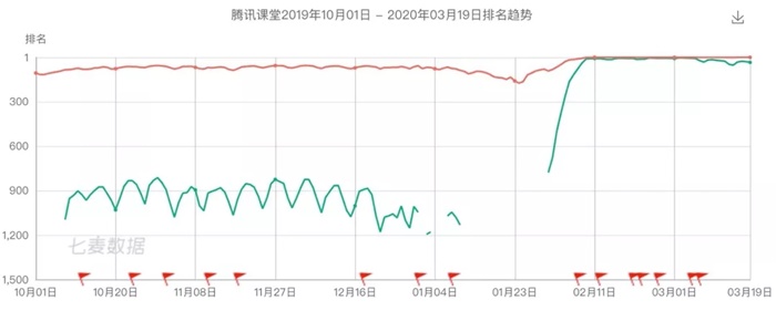 此外,疫情期间,腾讯还有一匹黑马——腾讯课堂,这个推出多年的APP在AppStore之前一直徘徊在1000名左右,疫情爆发后迅速蹿高,最高到达了第5名的高位。