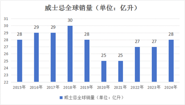 以烈酒最大品类威士忌为例,十年来,销量始终在28亿升水平徘徊,疫情后始终在艰苦爬坡。