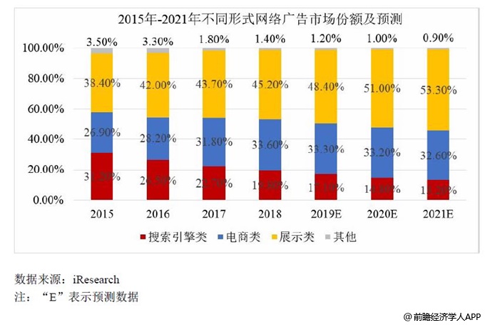 展示类营销是依托各类网站、移动APP,通过文字、图片、动画、视频等形 式,展示广告内容的营销方式。展示类营销主要包括品牌图形广告、视频贴片广 告、富媒体广告、文字链广告等,以及最近出现的信息流广告。由于其种类多样、 表现丰富、展示直观的特点,决定了其应用范围广、能够满足客户多方面需求, 占有最大的市场份额。